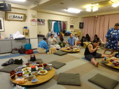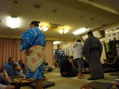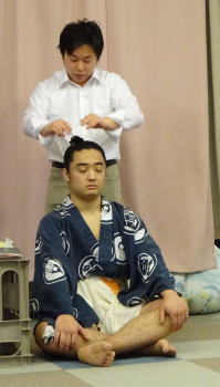 ![]() 大阪の天理教のビルに仮住まい。 テントの近くでは撮影禁止 → → → 離れて撮って アップしてみると。 ![]() 食事をよばれた大きな部屋の壁面に飾られた手形や 横綱日馬富士の写真。 用意された昼食。赤いお椀が「ちゃんこ」。 稽古を終えて汗を流した力士たちの髪結い。 親方・元 旭冨士 と 共に。 安美錦 と 共に。 ![]() ----------- 伊勢ケ浜部屋は 多くの力士がいて 賑わっている。---------- 大阪場所に向けて 稽古に励んでいる 伊勢ケ浜部屋の力士たちの稽古を 見学しに行った。 「 稽古中の写真撮影は ご遠慮ください 」 の張り紙が あちこちに貼ってあるので 折角 同行の友人の七光りで 特別に 稽古中のテントの中に入れてもらい 横綱・日馬富士 や 安美錦 なども 目と鼻の先に居るのに シャッターが切れずに 至極 残念 !! の思い。 息づかい荒く ハアハア 言いながら いくどもいくども 繰り返し 体当たり していく 若手。 胸を貸す先輩力士。 見守る 親方。 横綱 そして 真剣勝負・・・・・・・・・・・ ・・・・・・・・・・・・・・・・・・ 1時間余りの 見学の後は 力士たちと 同じ部屋で 昼食。 「ちゃんこなべ」の「なべ」そのものは テーブルにセットされてなかったが 席に着くと 若い力士が お椀に入れて 奥から 熱々を 運んで来てくれた。 ご飯と共に。 から揚げや サラダや 焼き魚や 煮物や 多種の おかずも用意されていた。 私たちは 親方( 元・旭冨士 ) と 同じテーブルに 招待。 日馬富士も 一緒のはずだったのが 谷町(?)のお誘いで そちらの方に。 残念!!! 相撲そのものは チケットを買って 見に行ったことがあるが 生稽古を しかも至近距離から 見られたのは 初めての 得難い!経験だった。
