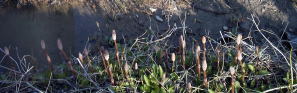 いつもの 散歩道。 我が家から ほど近い 貸し農園と道路の 境い目辺りに、つい 先週までは わずか 数本の“つくし”の 数センチにしか 伸びてないのだけが 目に入ってたのだったが 今日は 其の辺り 一帯に 成長している“つくし”を 発見。 例年 あまり 意識に乗らないのだが 今年は なぜか 通る度の 観察となってしまった。 春の兆しと共に 小さくとも 逞しさが 備わって来たような・・・・・・・・・気もする。 好きな人が 抜いていけば 結構 食卓の一品に?? などと 思ってしまう量もある。 川に出ると 今朝は 大ぶりの鴨のペアーが エサを漁っている場面に 出会う。 穏やかな 陽光が感じられて 「春近し・・」の思い。