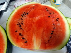 7kg。外周 72cm。 縦二つにカット。 左 半分。 右 半分 西瓜を 頂いた。 西瓜の表面のラベルに 「京都和知産」 の 表示がある。 ずっしりと 重たい。 体重計に載せてみると 約 7㎏。 丸いままの西瓜を買うことは まずないので、長女一家が来る時まで 切らずに 置いておくことに。 長女の長女に 丸く 大きい西瓜を見せて 目を丸くして 驚き 喜ばせよう という 算段。 冷蔵庫の段を外して 丸丸西瓜を すっぽり その中に。 西瓜は さわやかな甘さで とても ジューシー。 大きな口を開けて パクパク・・・・・・の長女の長女。 量は たっぷり あるので ここ暫くは西瓜を楽しめそう・・・・・・・・・・・(*^-^*)・・・・・・・・・・・・