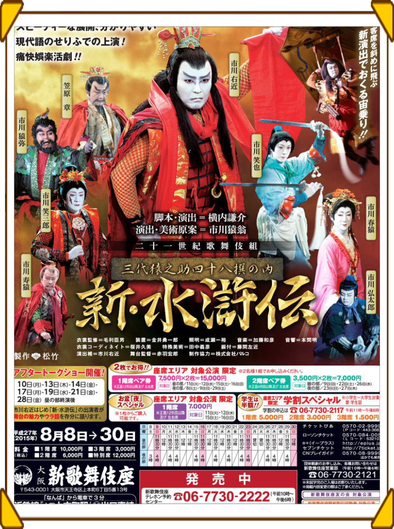 スーパー歌舞伎を、大阪 新歌舞伎座で 1階10列目の座席より観賞。 客席を斜めに飛ぶ 新演出でおくる宙乗り!! スピーディーな展開、分かりやすい現代語のせりふでの上演! 痛快娯楽活劇!! と パンフに 「歌舞伎」とは 言うものの、セリフは、現代語で、イヤホンガイドも要らず 自力で ややこしい人名に基づく人間関係を 整理しながら、舞台に魅入る。 2002年2月に 市川猿之助二月大歌舞伎として 「南総里見八犬伝」を 大阪松竹座で 2008年5月に スーパー歌舞伎として、「ヤマトタケル」を やはり、大阪松竹座で 2011年3月に 猿之助四十八撰の内 「獨道中五十三驛 (ひとりたびごじゅうさんつぎ)」 ーーーー 市川右近十五役早替りならびに宙乗り相勤め申し上げ候 ----を 京都南座で観賞。 2013年8月に、大阪 新歌舞伎座で、「新・水滸伝」 スーパー歌舞伎の観賞