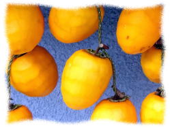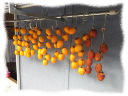 ここ数年 渋柿狩りをさせてもらっていた 友人宅の渋柿が 今年は さっぱり 実をつけていない ということで 別ルートで 渋柿をゲットした。 毎年 徳島県の業者に 依頼する友人に 一緒に依頼してもらった。 L寸で 10キログラムが 手元に。 早速、皮をむいて 縄に通し 熱湯につけて ブランデーをスプレー。 そして 軒下にぶらさげる。 数日前に吊るした スーパーで手に入れた10個の渋柿は もう かなり熟して いい色に なってきている。 日に当たり 風にさらされて 見るからに 美味しそうな 吊るし甘柿に 変身するのに そう 長くは かからない と 思っているのだが・・・・・・・・・・・・・ |