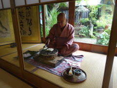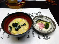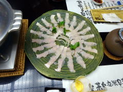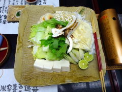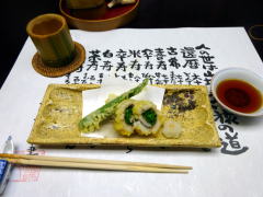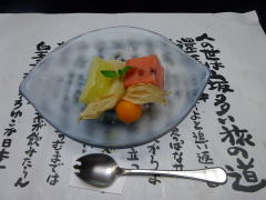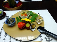 いつもの 「みのお茶寮」 「桜」の間 オーナーが手掛けてられる盆栽・お庭の木々。 ![]() 食前酒・・ 象鼻杯 先付・・焼き鱧・生うに・翡翠ナス 他 冷酒・・竹酒で。 ![]() お造り・・鱧ちり・引っ下げ 他 お凌ぎ・・鱧ずし・木の葉生姜 八寸・・鱧のマリネ・精進和え・ 他 ![]() オーナーが炭火で。 焼き物・ ・鱧ちくわ ・・鱧の木の芽焼き ![]() 揚げ物・・・鱧の南蛮揚げ・伏見辛子 他。 鍋・・・レタス・早マッタケ・豆腐・ 鱧 他。 ![]() 御飯・・・雑炊・漬物 デザート・・・マイクロトマト・スイカ 他 丁度 今が 旬 の 「鱧づくし」を賞味しに いつもの 「みのお茶寮」へ。 通してもらう部屋も いつもの 「桜」の間。 食前酒が梅酒の場合も よくあるのだが 今回は 誰が考え出したか 蓮を途中で切り落とし、 そのハスを用いて 葉の広がりの部分にお酒を注ぎ 茎の切り口の部分から 葉に注いだ酒を飲む という 極めて 風流な「象鼻杯」の食前酒から 始まった。 ・ ・ ・ 「鱧鍋」では 早くも 「松茸」が登場して 全員 “今季のお初” で 舌つづみ。 ウイークデイのランチに 心地いいもてなしを受けながら ゆったりと 寛いで 好物の数々を 楽しんだ。