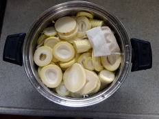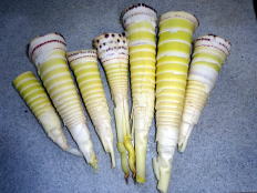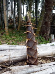 ![]() 「孟宗竹」の筍の時期が 終わって 最近は 「破竹」の筍が 店先に 並ぶようになった。 「柔らかいのですか?」 と 尋ねてみて 「柔らかいですよォ一」 で 一度 試してみることに。 値は 「孟宗竹」の筍より 安く ゲット出来る。 包丁を入れてみると 黒っぽい表皮は 少々 固め だが 中身は とても 柔らかく 掘りたての手ごたえ である。 長いものは 30cm以上もあって 中身も それなりに しっかり 詰まっている。 二盛分 全部 輪切りにして たくさんに なった タケノコたちを やっぱり ぬか袋と共に 2~30分ほど湯がく。 冷めたら 孟宗竹と 同様に 味付けをして 食卓へ。 旨さや きめの細かさには やや 欠けるが でも 十分 おいしい と 結論。 今回 初めて 一部を 昆布と一緒の 佃煮にも。
