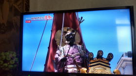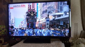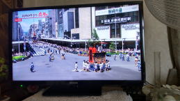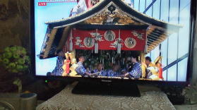 気楽な 恰好・スタイル で、気楽に、自由に、寝室のテレビ の 祇園祭巡行 画面に見入る。