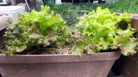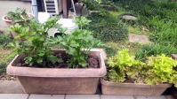 プランターに植わっている、【 セロリ 】と, 【 レタス 】と, 【 ネギ 】 を