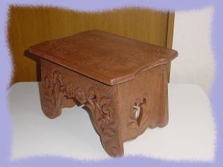 自由作品<5>【マガジンラック】 四面彫りである。 リボンのラインの「滑らかさ」 各花の「向き」 各花弁の「窪み」 等々・・・ 各素材の表情付けに、どうしても 四苦八苦の状態が続く。 高さ 34cm 幅 45cm 奥行き 20cm 完成 2004・10 |